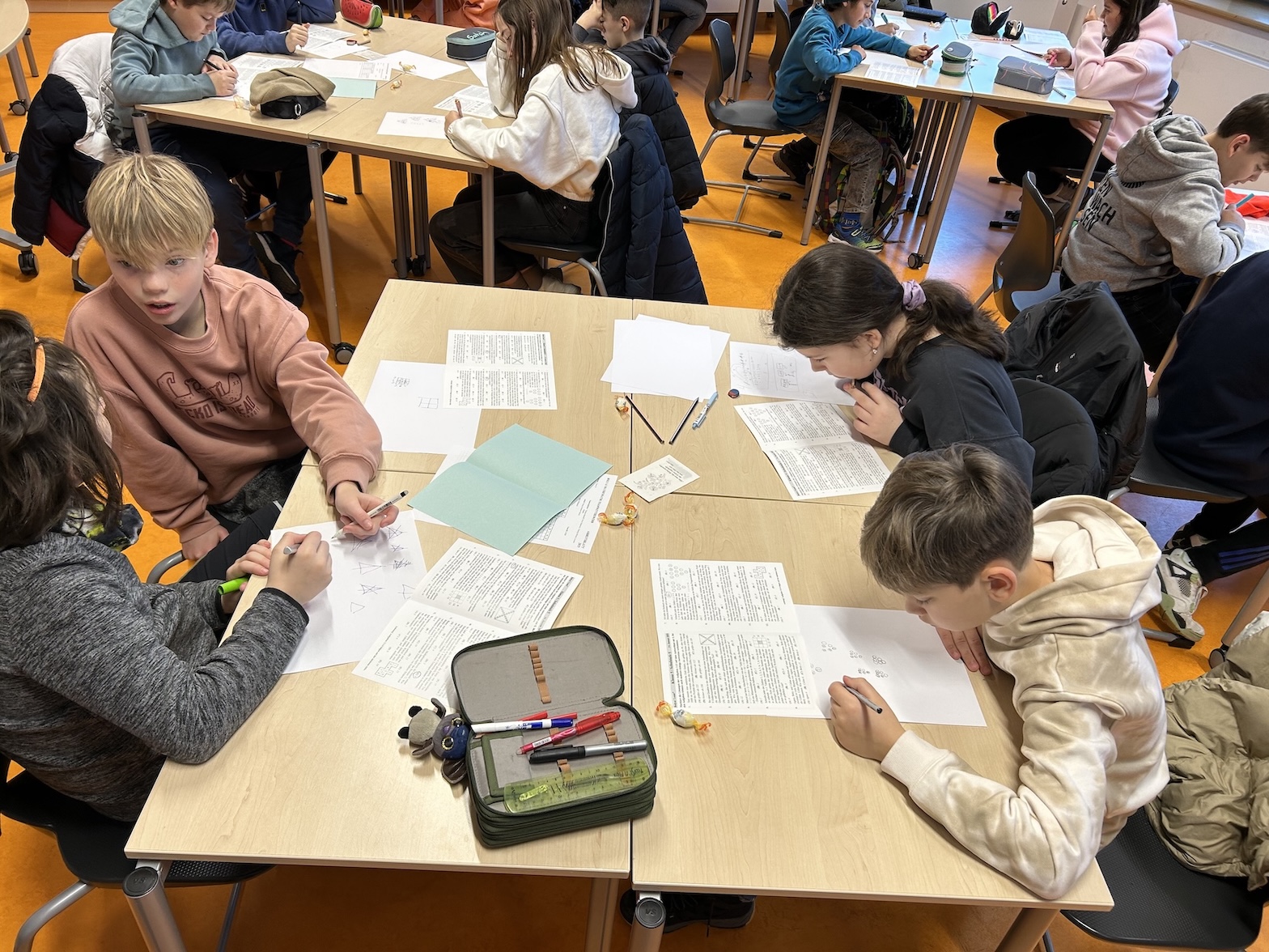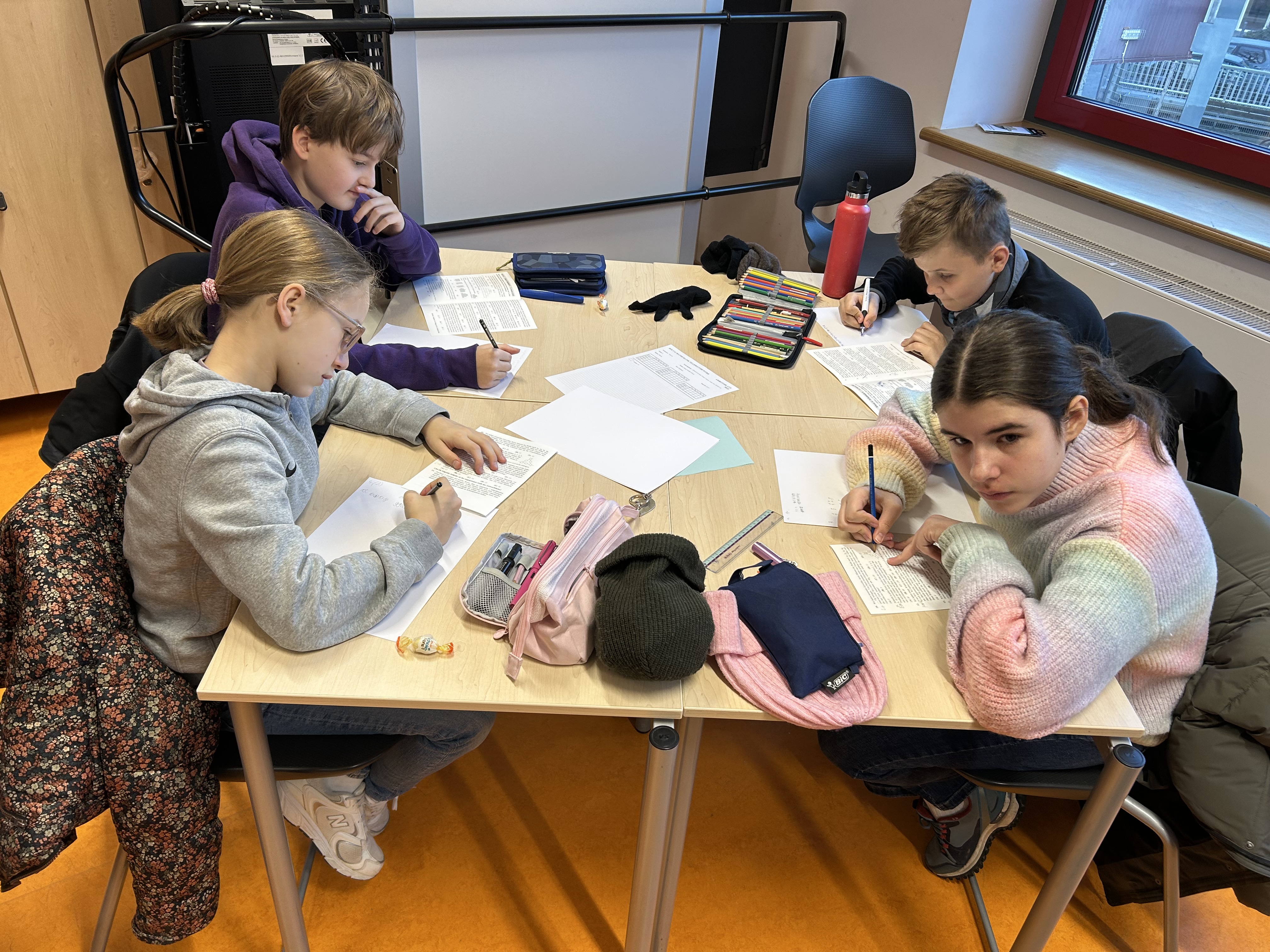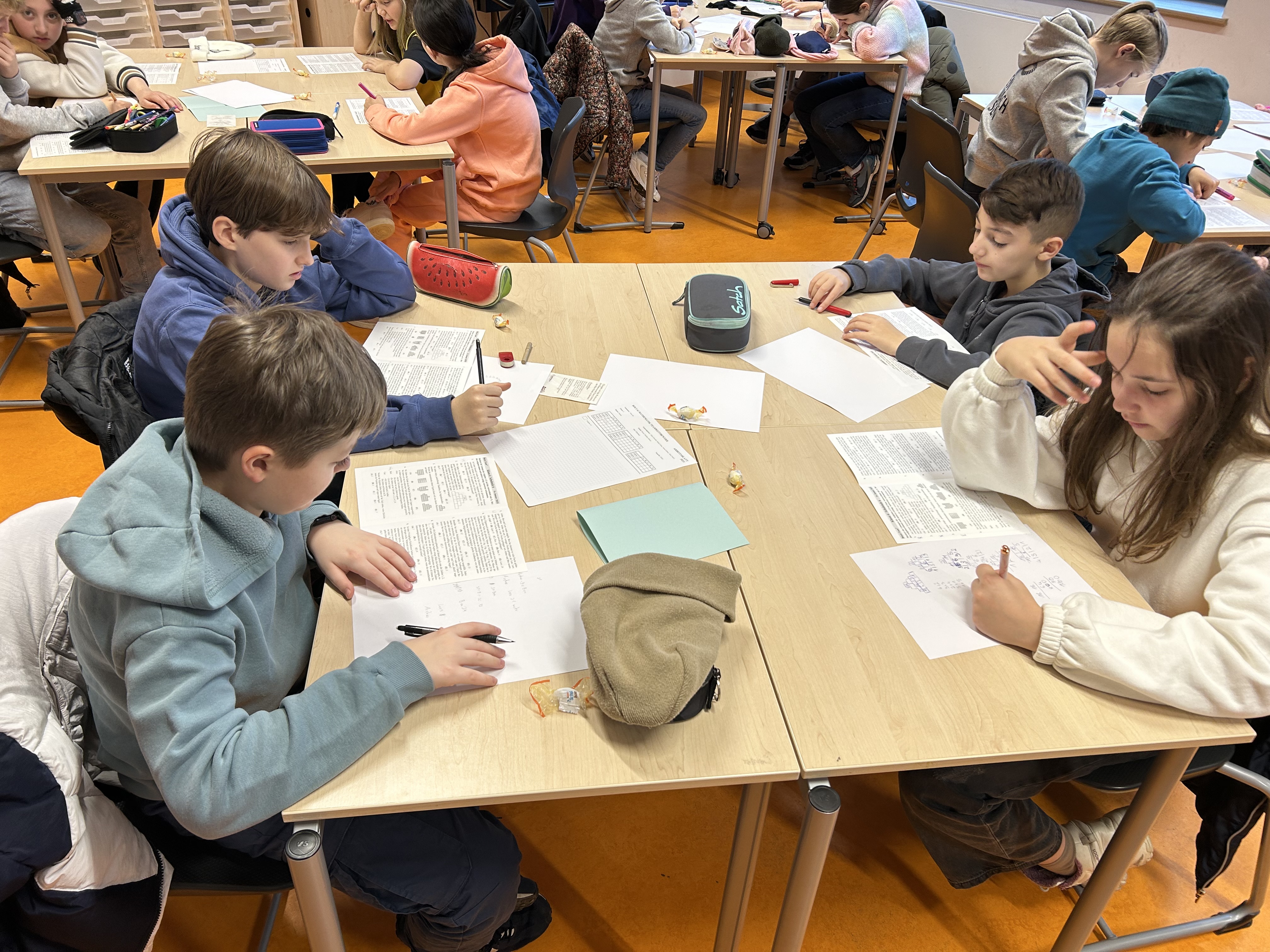 Jede Klasse wählte ein Team aus vier Kindern, die gemeinsam antraten, um verschiedene knifflige Aufgaben zu lösen. Dabei konnten diese aufgeteilt oder zusammen bearbeitet werden. Zur Vorbereitung und Einstimmung gab es daher schon im Dezember ein Vortreffen. Für jede Aufgabe musste am Ende angekreuzt werden: Ist eine der gegebenen Lösungen richtig, zwei, drei, vier, alle fünf oder sogar keine?