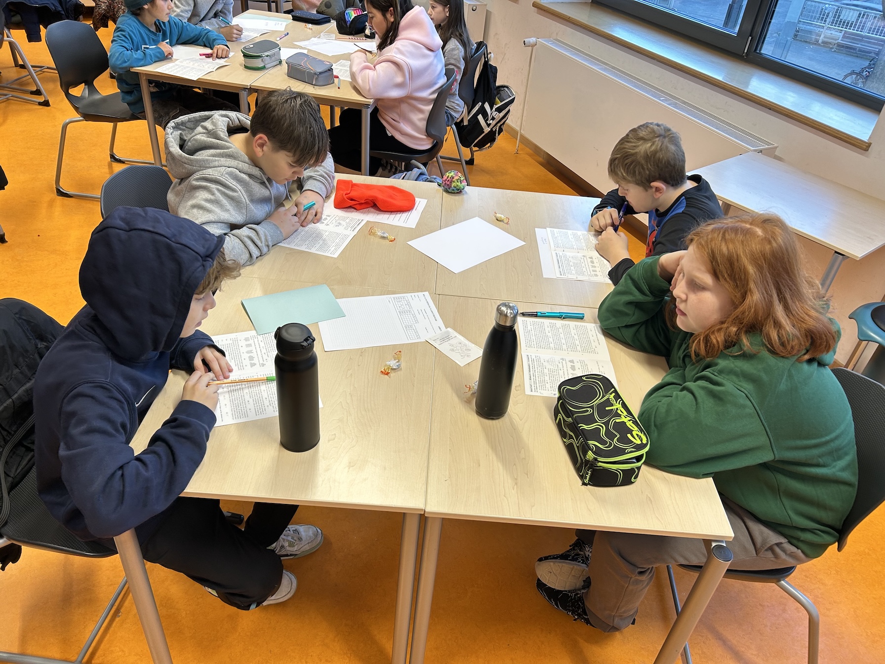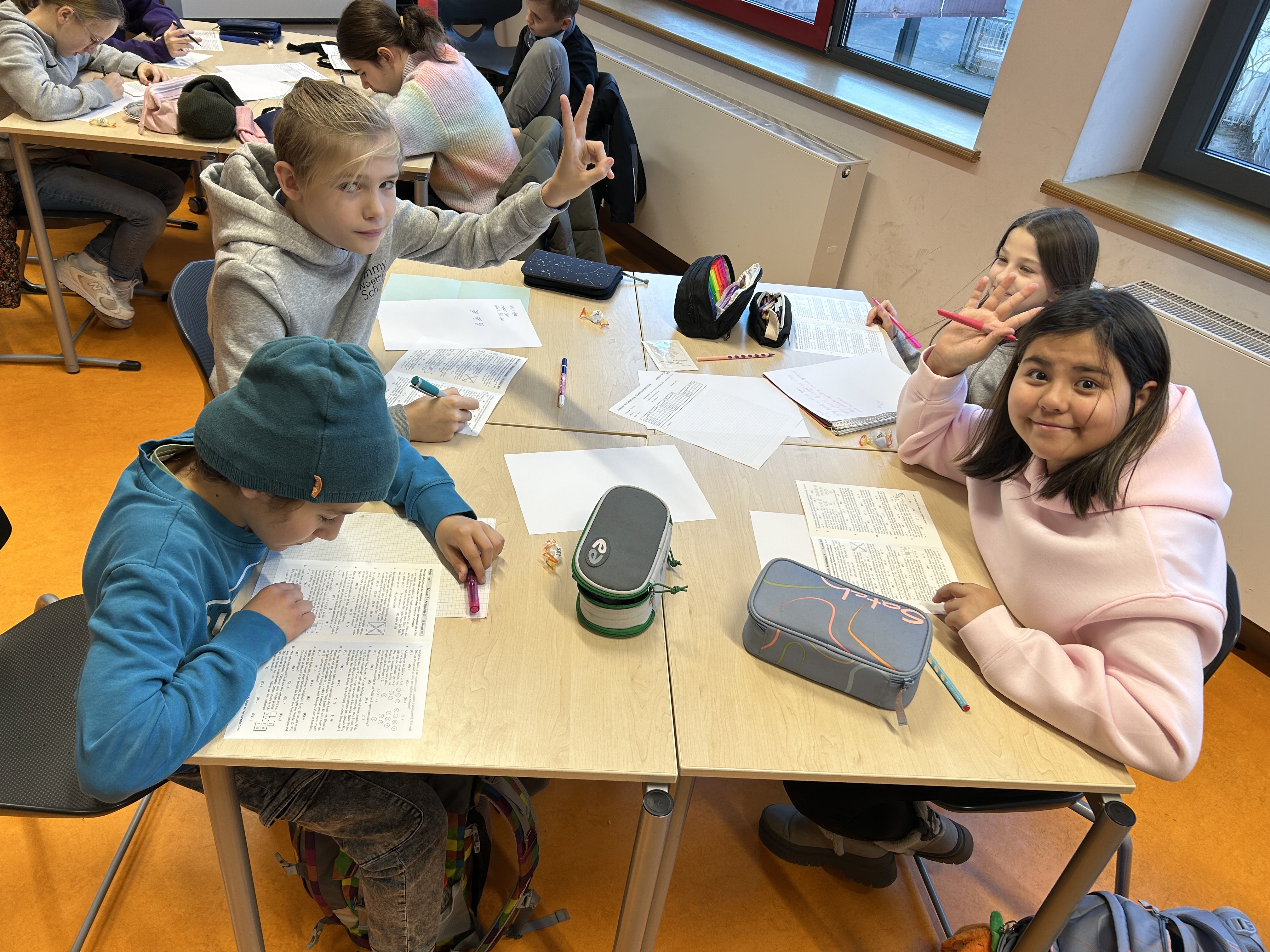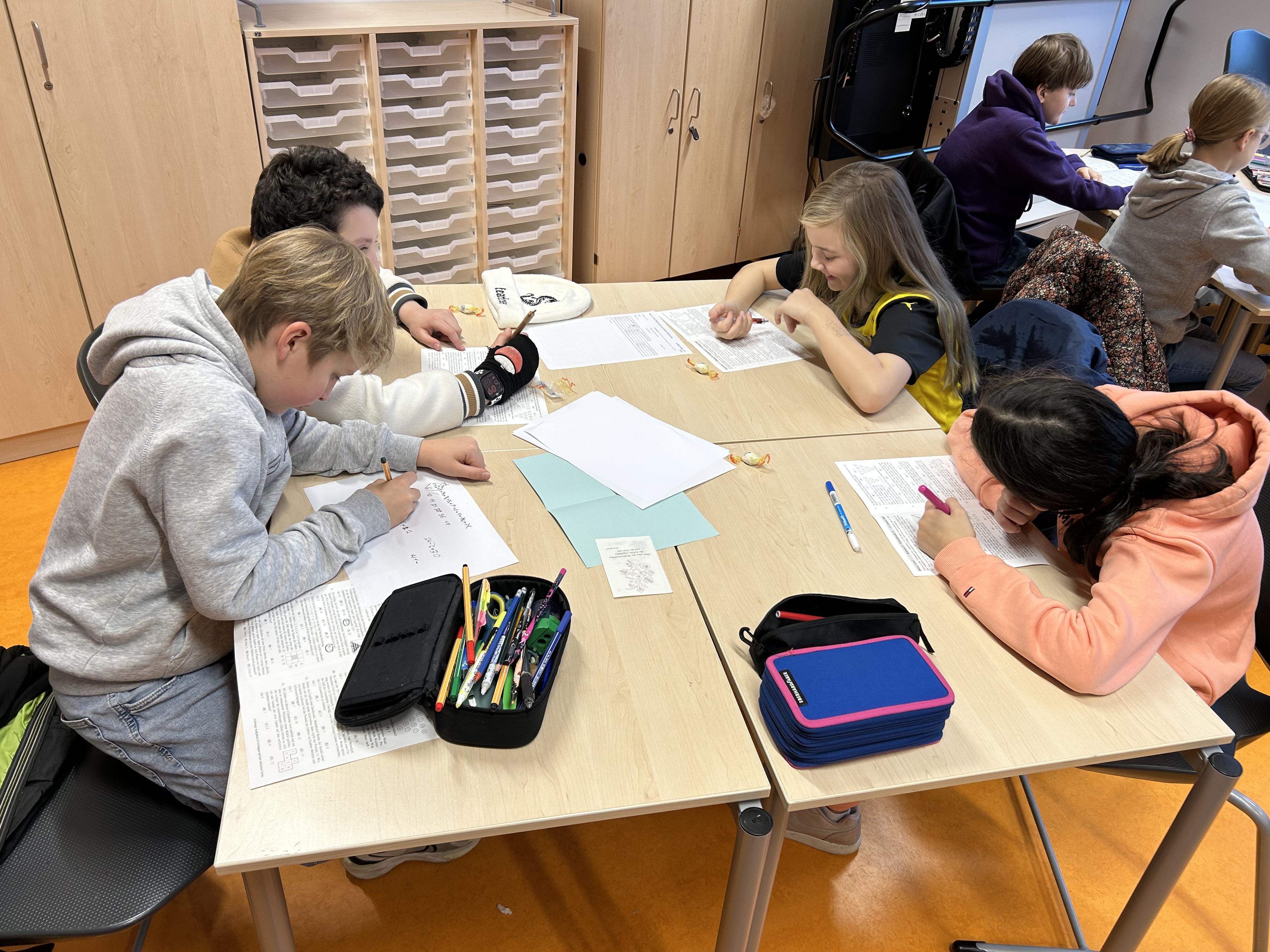 Jede Klasse wählte ein Team aus vier Kindern, die gemeinsam antraten, um verschiedene knifflige Aufgaben zu lösen. Dabei konnten diese aufgeteilt oder zusammen bearbeitet werden. Zur Vorbereitung und Einstimmung gab es daher schon im Dezember ein Vortreffen. Für jede Aufgabe musste am Ende angekreuzt werden: Ist eine der gegebenen Lösungen richtig, zwei, drei, vier, alle fünf oder sogar keine?