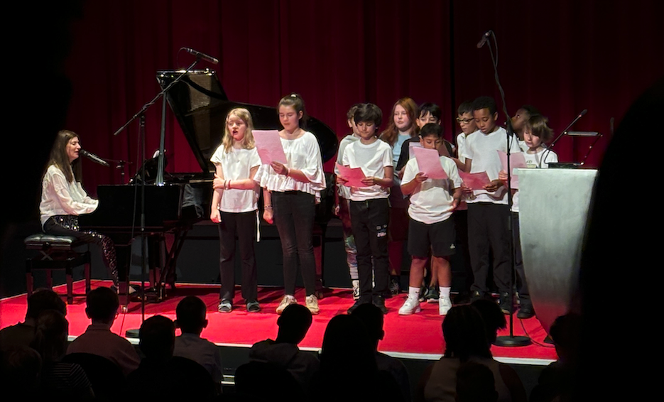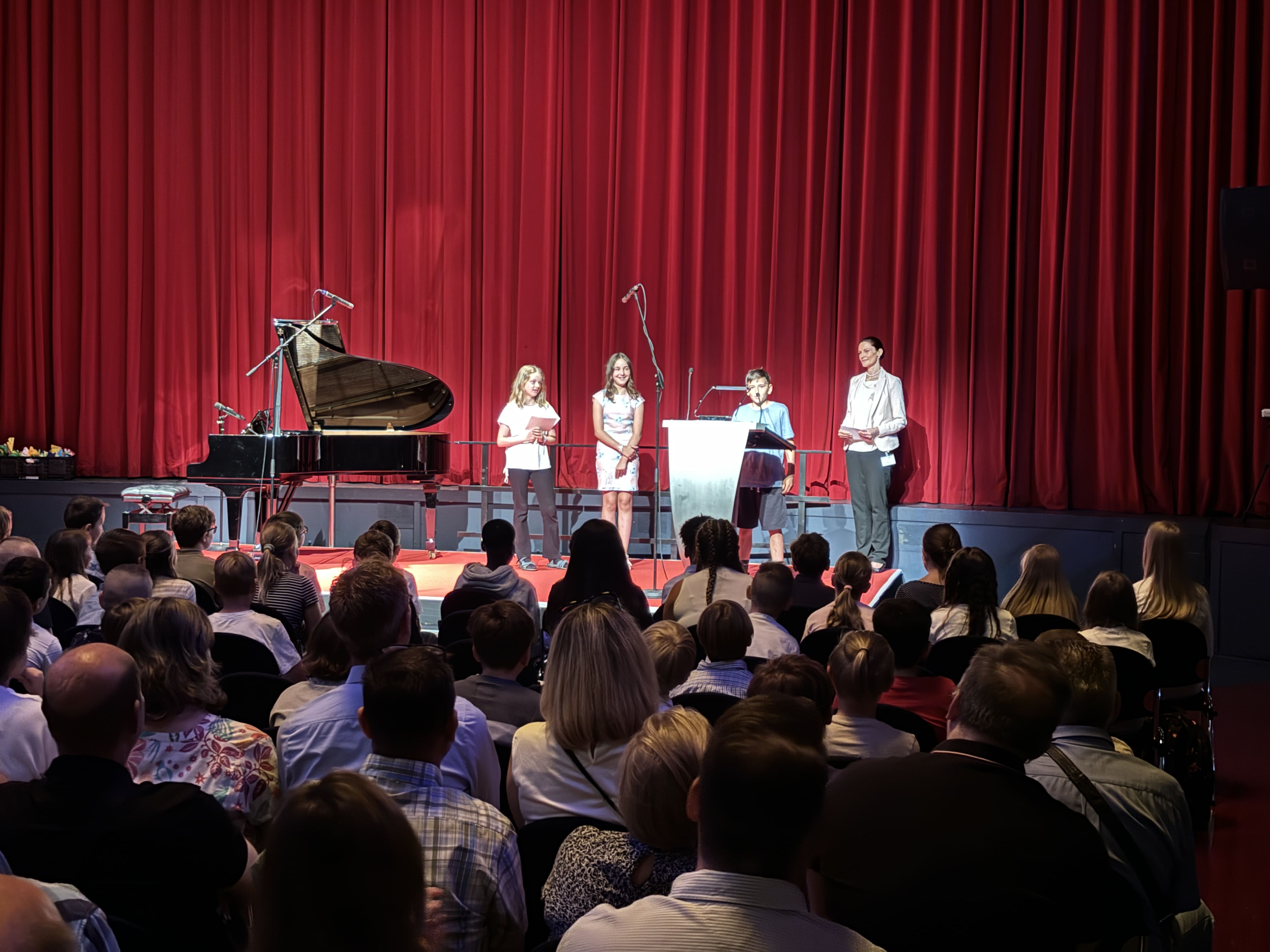 Die Schülerinnen und Schüler erwartete ein vielseitiges Programm, beginnend mit einem aktivierenden Warm-Up unserer geschätzten Kollegin Moriah-Jane Lorentz, das ausnahmslos alle im Saal anwesenden Menschen tanzen und so die Aufregung vergessen ließ. Redebeiträge der Schulleitung, der Schüler- und Schülerinnenvertretung sowie des Schulelternbeirats/Fördervereins hießen die frischgebackenen neuen Mitglieder der Emmy-Noether-Schule herzlich willkommen und stellten diejenigen Lehrkräfte vor, welche die Kinder in ihren Farbgruppen während der laufenden Woche des Ankommens betreuen würden. Musikalische Beiträge von Bettina Blöcher, teilweise begleitet von dem Schulchor, rundeten die Veranstaltung ab.